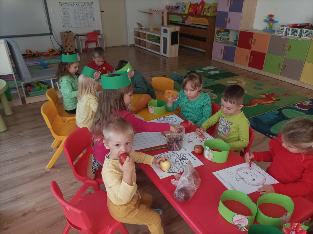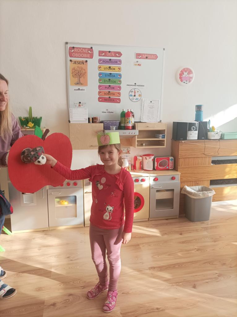 V rámci zdravej výživy si škôlkári pripomenuli Svetový deň jablka - 21. október. Deti prišli do škôlky oblečené vo farbách jablka. Vyrábali si čelenky s jablkom, pozreli prezentáciu a spievali pesničku o jabľčku. Zahrali si hry a kreslili. Ochutnali jabľčka, jablkový koláč a jablkový džús.