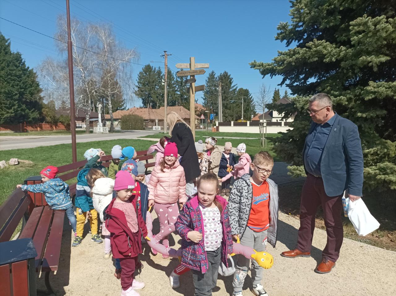 V rámci pobytu vonku sme sa vybrali na jarnú prechádzku do záhradného centra pozrieť kvietky a prebúdzajúcu sa jarnú prírodu. Cestou sme sa zastavili pred Obecným úradom, kde sme pozorovali bocianov. Stretli sme sa aj s pánom starostom, ktorý sa s deťmi porozprával a potešil ich sladkou maškrtou.