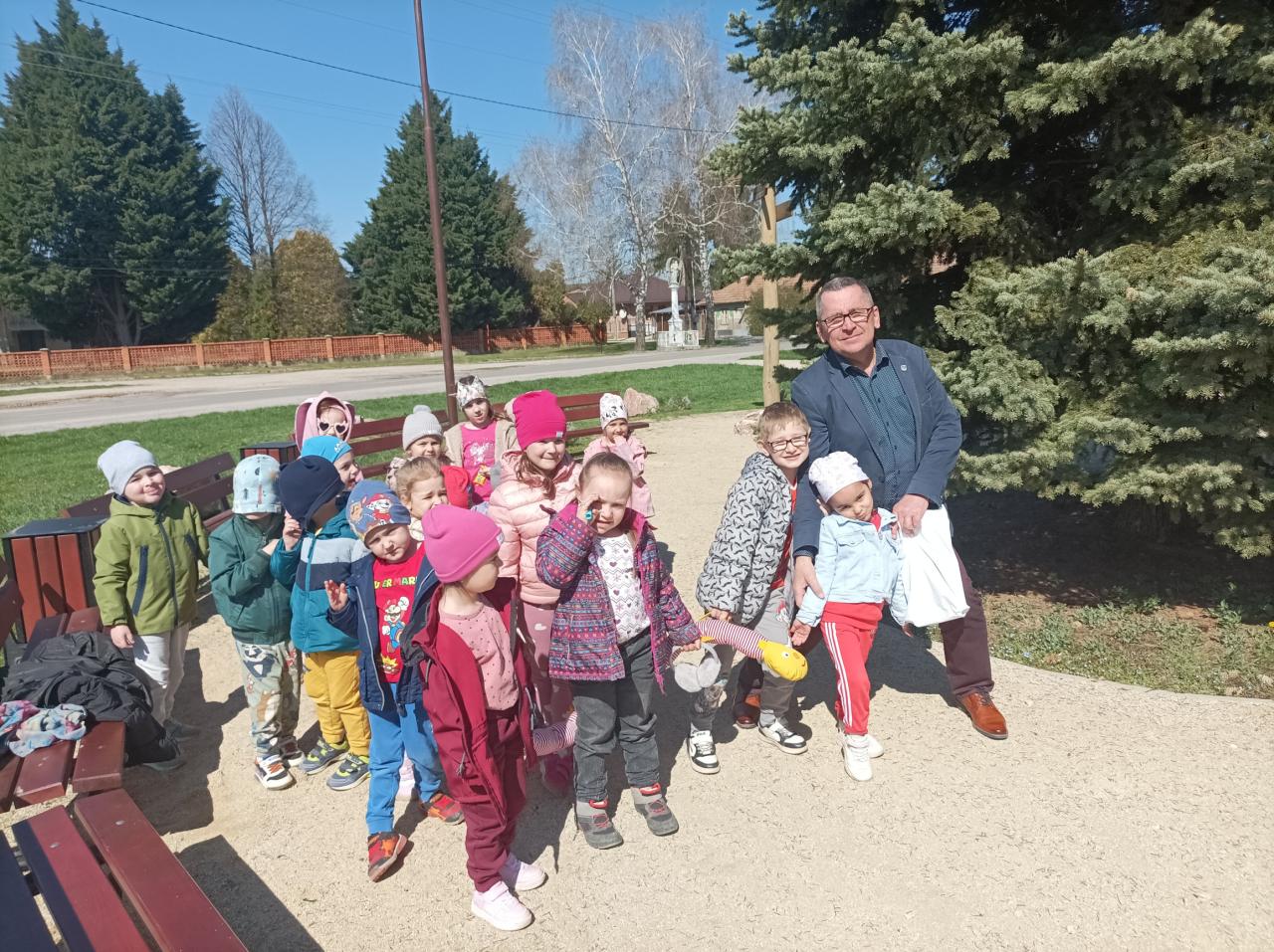 V rámci pobytu vonku sme sa vybrali na jarnú prechádzku do záhradného centra pozrieť kvietky a prebúdzajúcu sa jarnú prírodu. Cestou sme sa zastavili pred Obecným úradom, kde sme pozorovali bocianov. Stretli sme sa aj s pánom starostom, ktorý sa s deťmi porozprával a potešil ich sladkou maškrtou.
