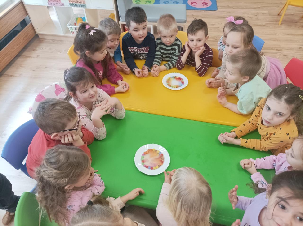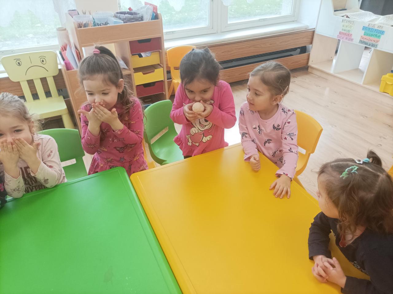 Detičky v MŠ si vyskúšali rôzne pokusy: zapúšťanie farieb krepovým papierom, lentilky s vodou, ktoré vytvorili dúhu, vajíčko v octe- pozorovanie ako škrupinka zmäkla, predmety plávajúce na hladine a pod hladinou, farebný dážď. Deťom sa aktivity veľmi páčili a niečo zaujímavé sa aj naučili.