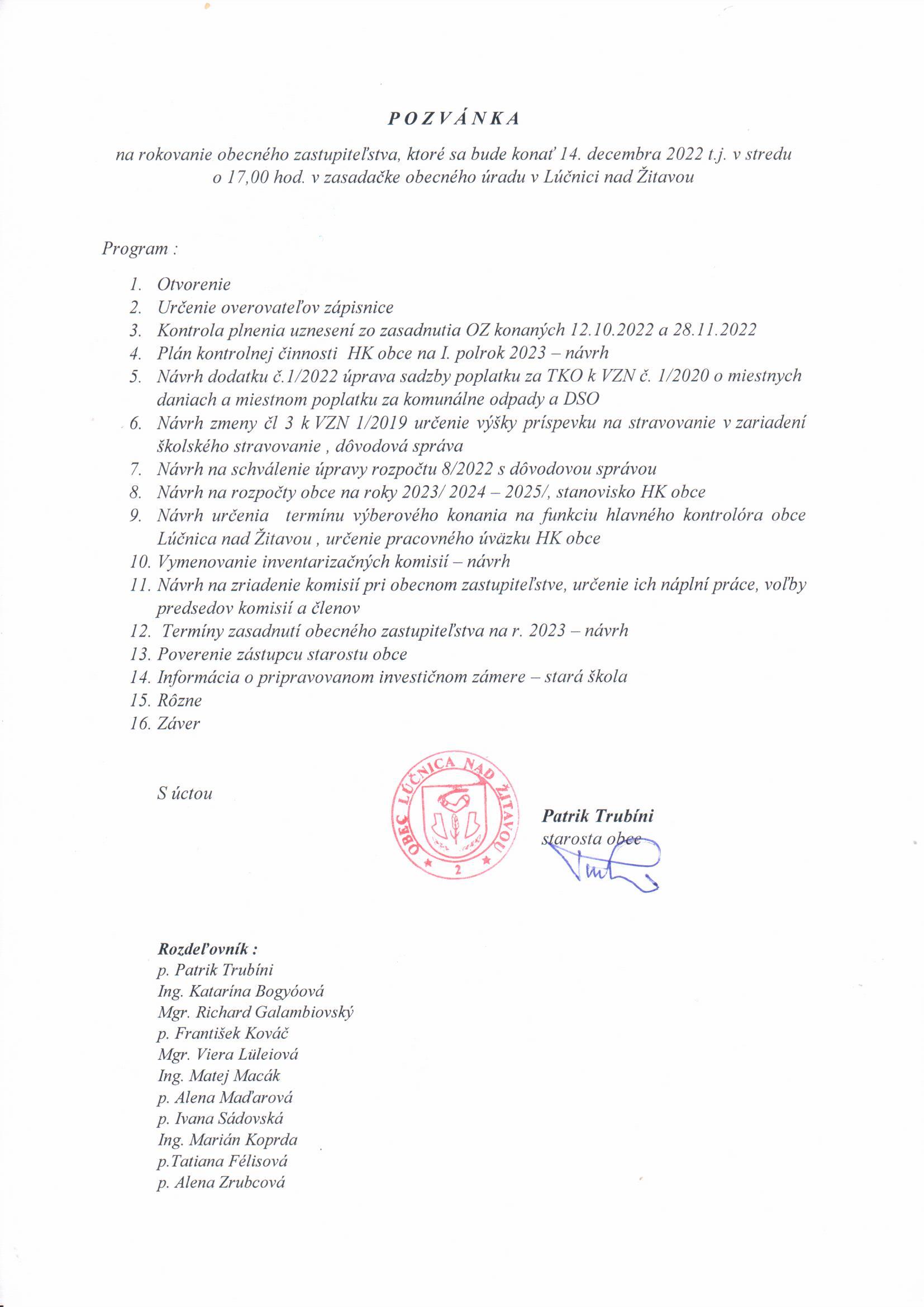 Zápisnica zo zasadnutia obecného zastupiteľstva v Lúčnici nad Žitavou zo dňa 14.12.2022 Stiahnuté: 197x | 21.12.2022