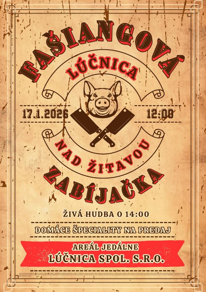 Fašiangová zabíjačka Milí spoluobčania! Srdečne Vás pozývame na fašiangovú zabíjačku dňa 17.01.2026 so začiatkom o 12,00 hod. v jedálni Lúčnica spol.s.r.o.