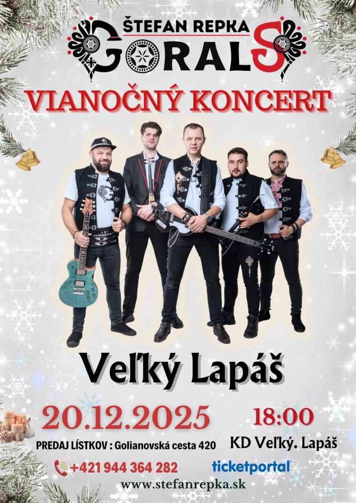 skupina Gorals Štefan Repka pozýva na Vianočný koncert, ktorý sa uskutoční 20.12.2025 so začiatkom o 18:00 hod. v Kinosále KD Veľký Lapáš. Cena vstupenky je 12 EUR.